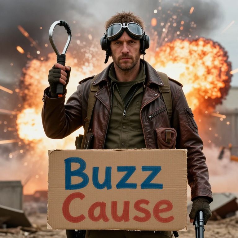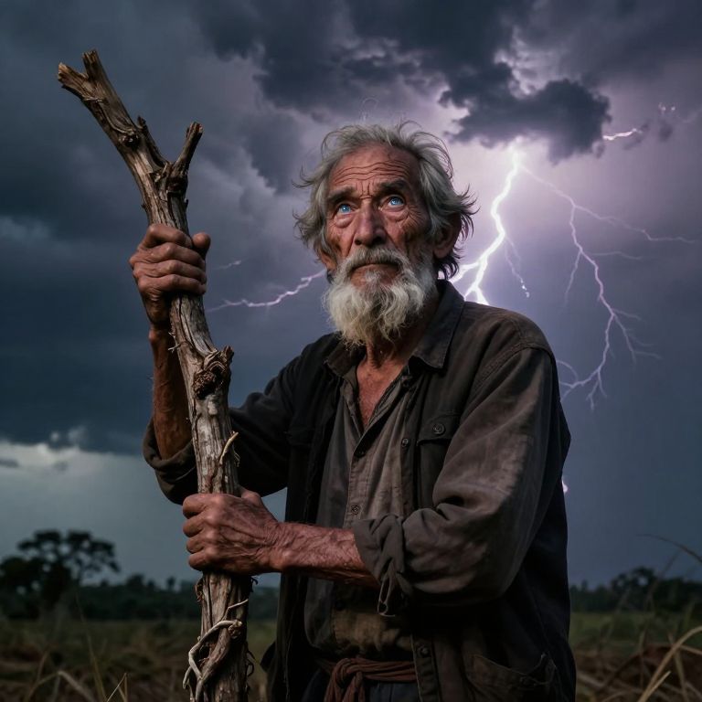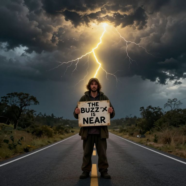 Realistic illustration of a male hobo, He is standing in the middle of the road, He has a sign that says: \"THE BUZZ IS NEAR\" The sky is filled with dark clouds, a yellow lightining strike is falling from the clouds to the hobo
