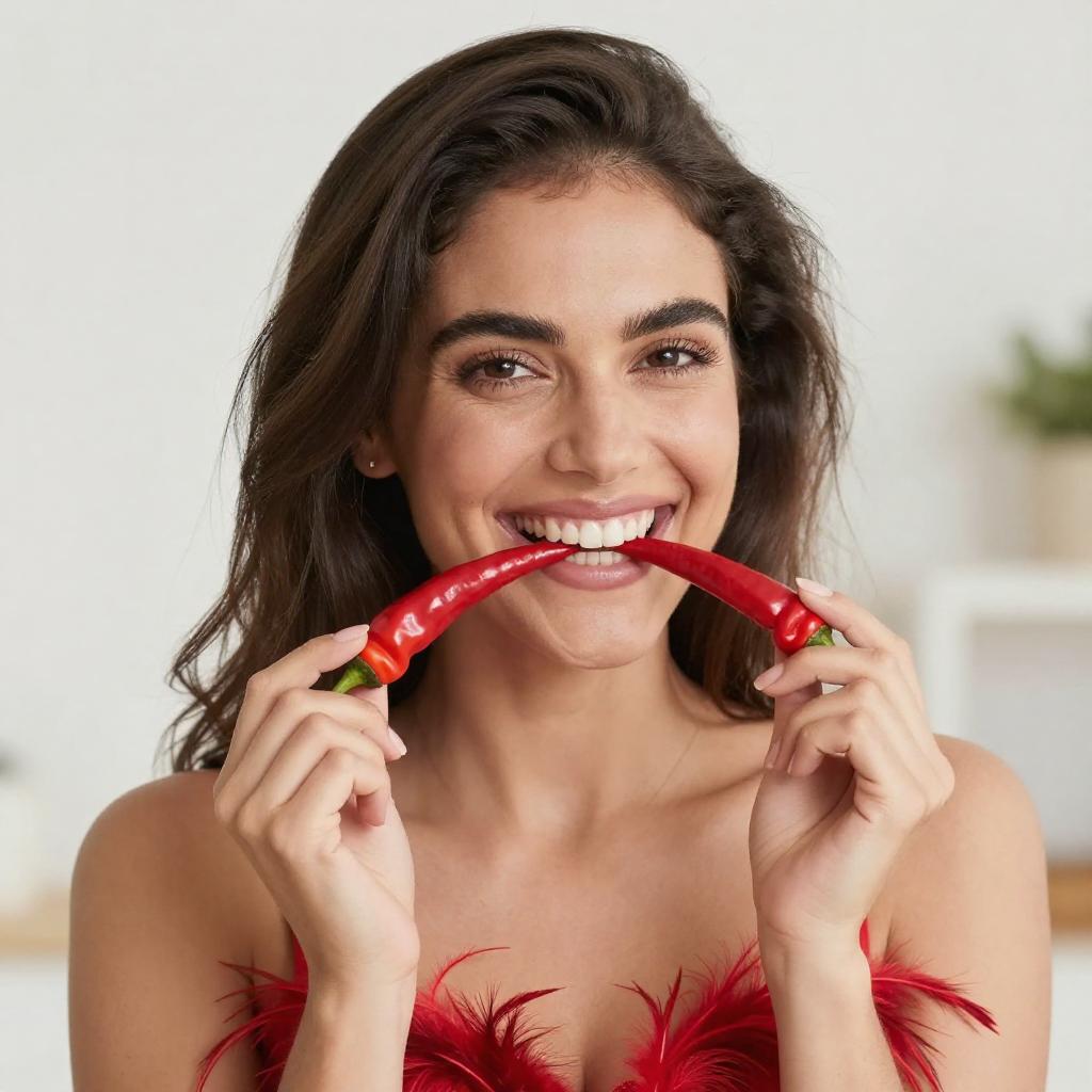 Photograph of a smiling woman with long dark hair, holding two red chili peppers—one in her mouth and one in her right hand. She's wearing a red feathered top. The background is completely white and blurred, creating a shallow depth of field that keeps the focus on her. The lighting is bright and even, highlighting her cheerful expression and the vibrant red peppers. Camera angle is slightly above eye level.