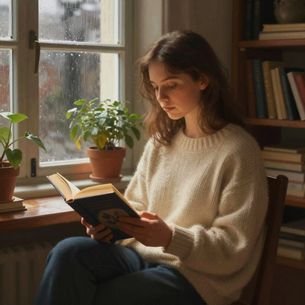 Photograph of a young woman with long, wavy brown hair, standing in a library. She wears a white, slightly wrinkled, long-sleeve button-up shirt and dark blue jeans. She is intently reading an open book, held in both hands, with a focused expression. The background features tall wooden bookshelves filled with a variety of books, arranged vertically. The lighting is natural, casting soft shadows, and highlights her fair skin and delicate features. The image has a warm, slightly vintage feel, with rich, earthy tones from the wood and books.