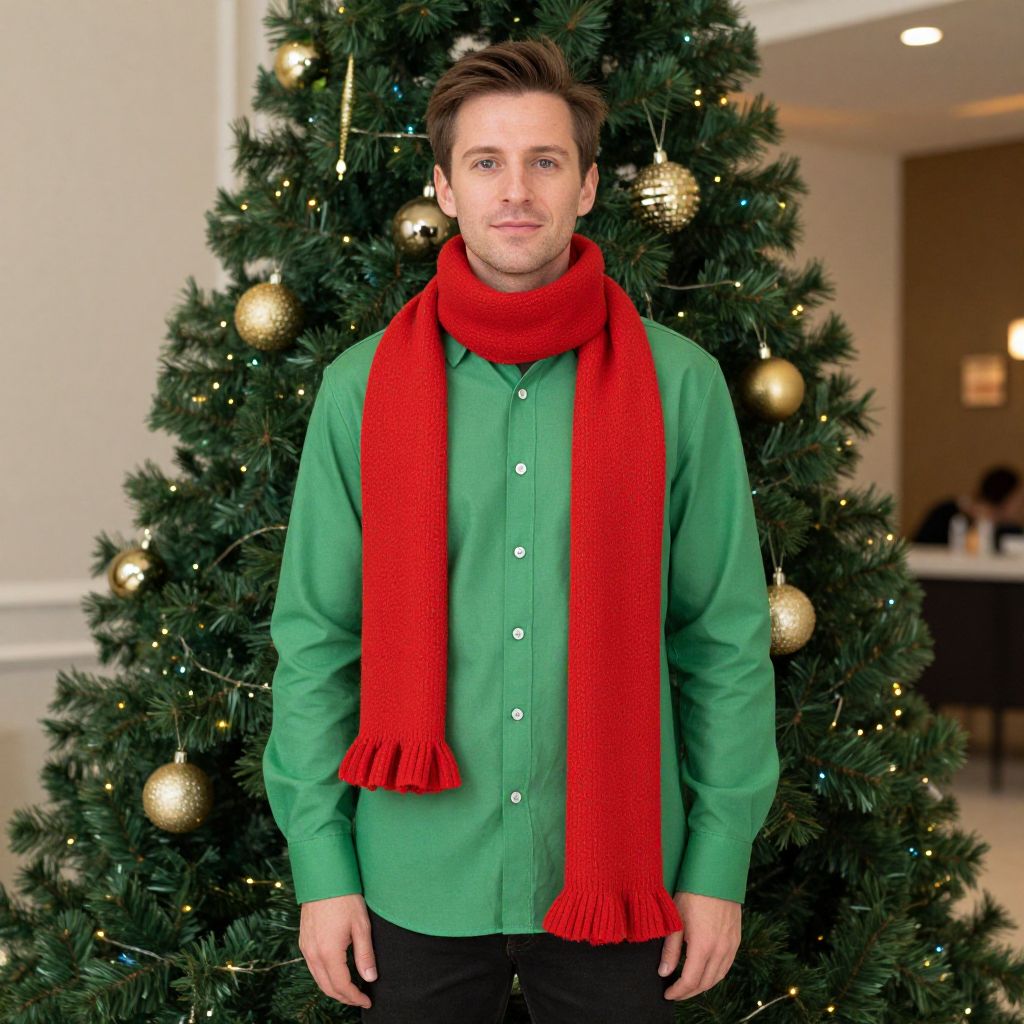 Man Holiday Outfit Costume, man in a green shirt and red scarf standing in front of a christmas tree