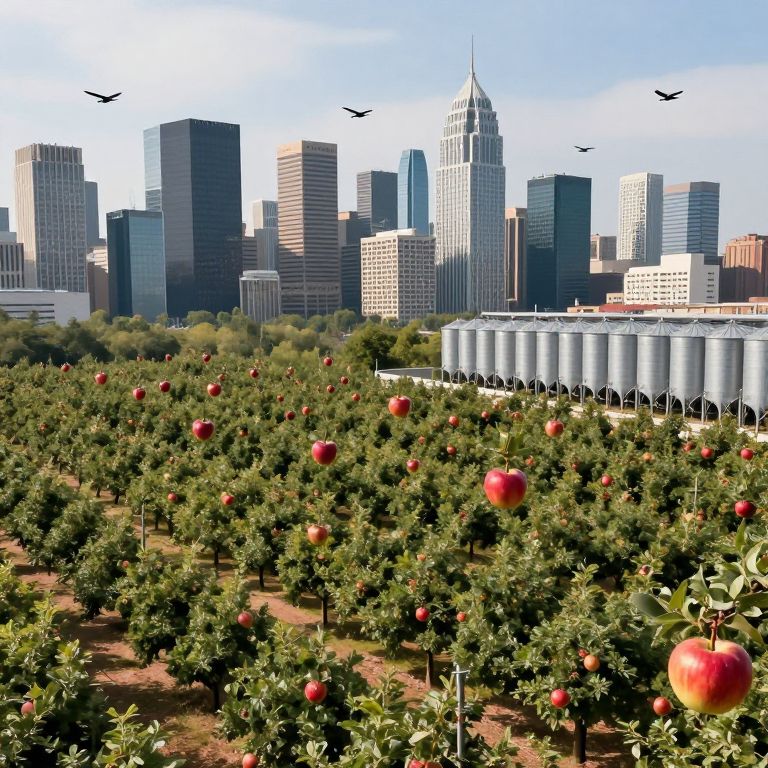Photograph of apple orchard with red apples, green trees, and industrial city skyline in background, featuring tall buildings and white tanks, with birds flying
