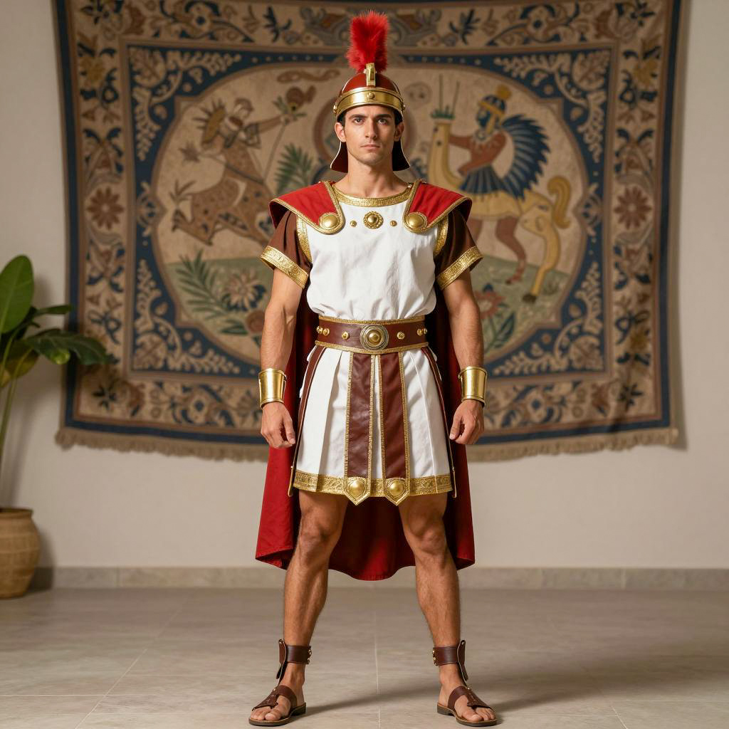 Costume dance, photorealistic, standing man, ancient Roman warrior costume, white tunic, red sash, brown sleeves, gold trim, red and gold headpiece with red plume, sandals, serious expression, neutral background, large decorative tapestry, green plant in corner, soft lighting, studio setting, full-body shot, realistic ures, historical clothing, detailed costume design, realistic shadows and highlights