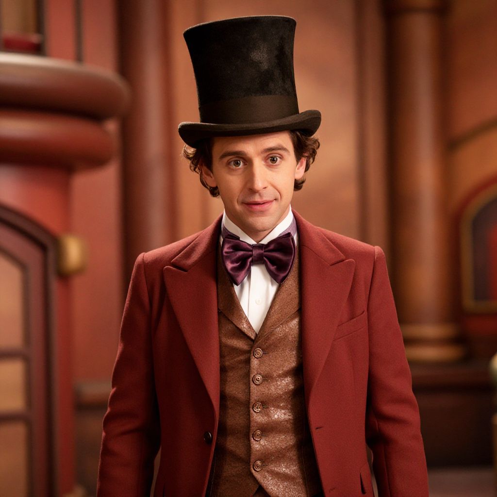"Willy Wonka Chocolate Factory Costume, image of a man in a top hat and bow tie"