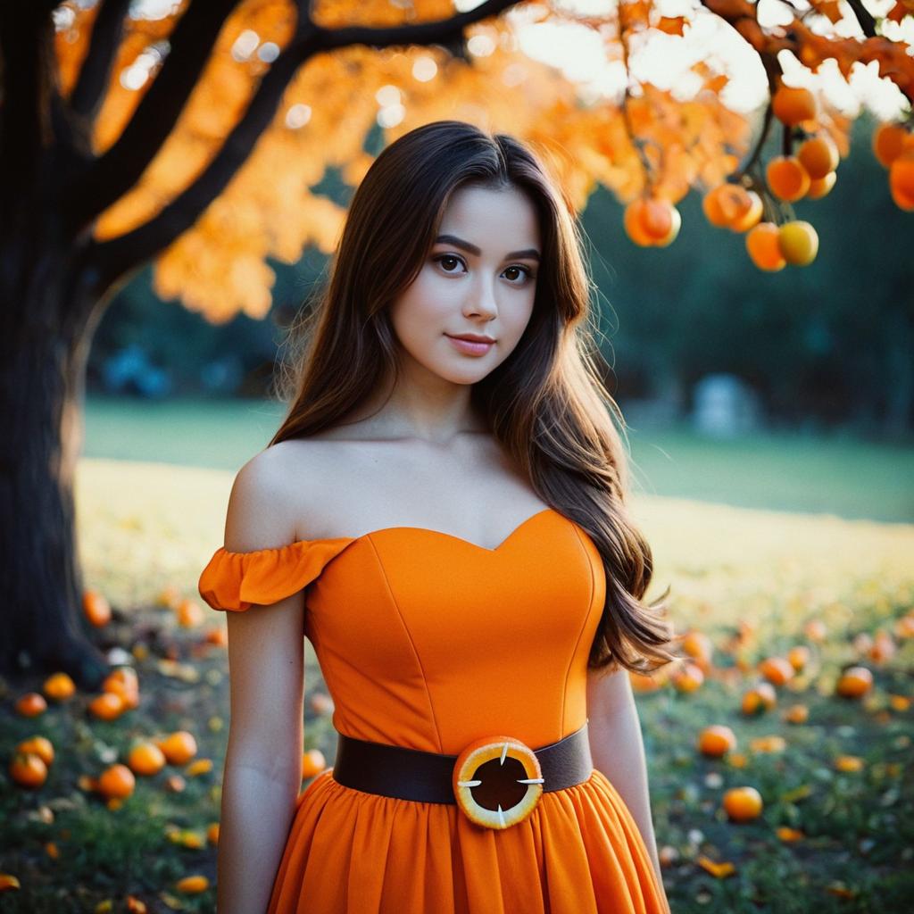 Pixar halloween costume,1girl, dress, solo, brown hair, tree, long hair, orange (fruit), outdoors, fruit, blurry, blurry background, food, belt, looking at viewer, bare shoulders, brown eyes