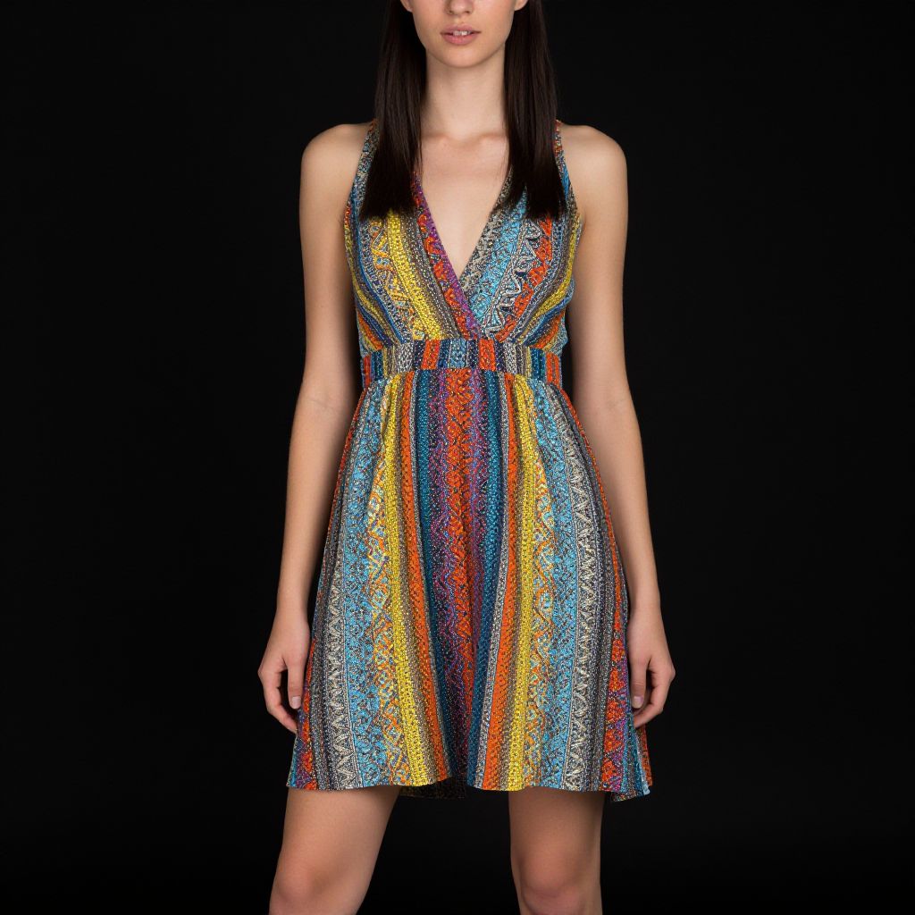 "Trendy Frocks, a woman in a colorful dress standing in front of a black background"