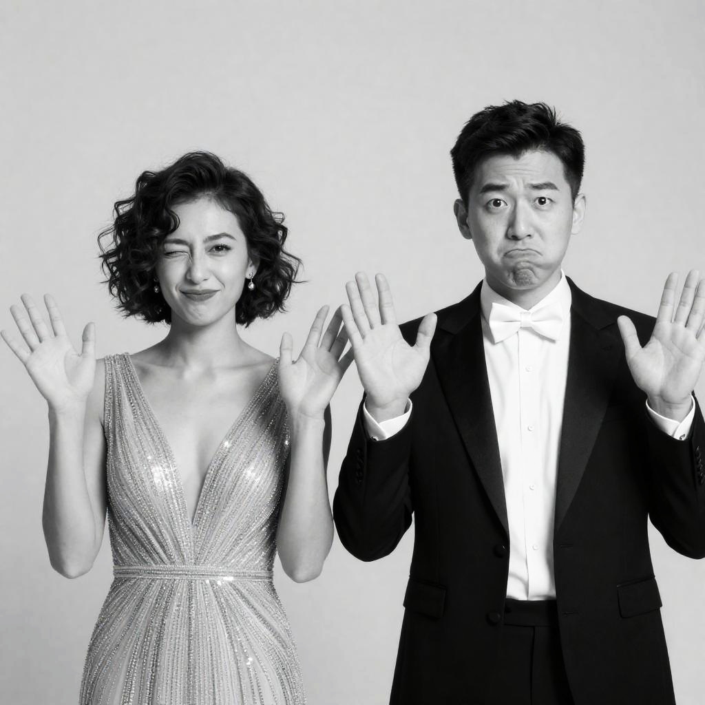Black and white photograph of a man and woman standing side by side, both with hands raised. Woman has short, curly hair, wearing a sparkling dress with a deep V-neck, winking. Man has short, dark hair, wearing a black tuxedo with a white bow tie, pouting. Background is plain and light-colored.