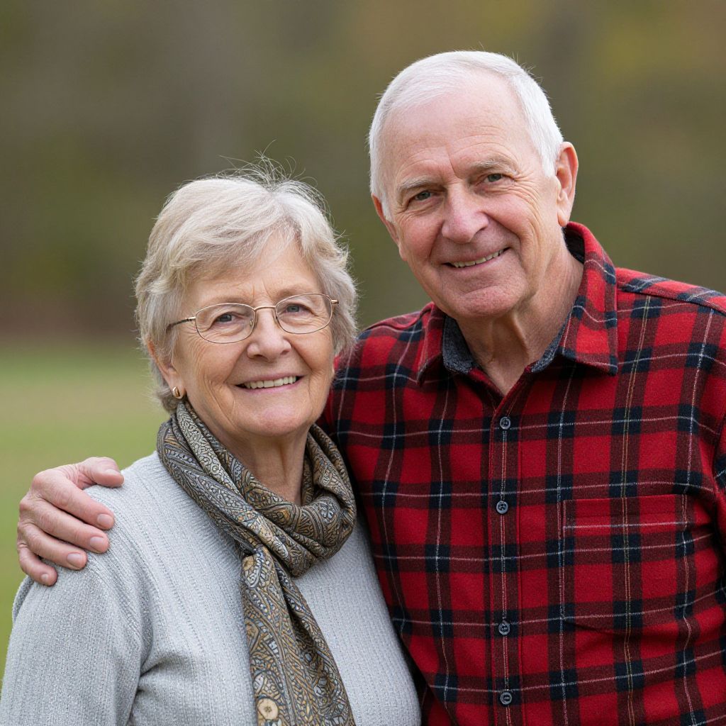 Elderly couple smiling warmly outdoors, with the woman wearing glasses and a patterned scarf, while the man in a red plaid shirt rests his hand affectionately on her shoulder against a softly blurred natural background.