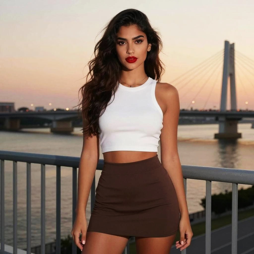 Photograph of a young woman with long, wavy, dark brown hair and tan skin standing in front of a bridge at sunset. She's wearing a white, sleeveless crop top with a keyhole cutout and a high-waisted, dark brown mini skirt. Her makeup is bold, with dark eyebrows and red lips. She's looking directly at the camera with a confident expression. The bridge and water are softly lit in the background.