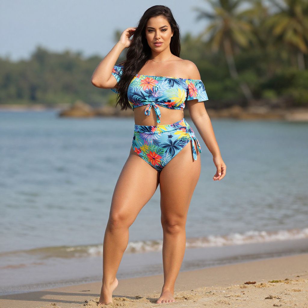 Full body shot, Curvy woman, vibrant wrap bikini, tropical print, soft stretchy fabric, adjustable ties, high-waisted bottom, matching crop top, off-the-shoulder sleeves, lightweight cotton blend, relaxed fit, playful ruffles, bright colors, sun-kissed skin, beach setting, confident pose Sexy. Pretty face and beаutiful eyes. Big breasts