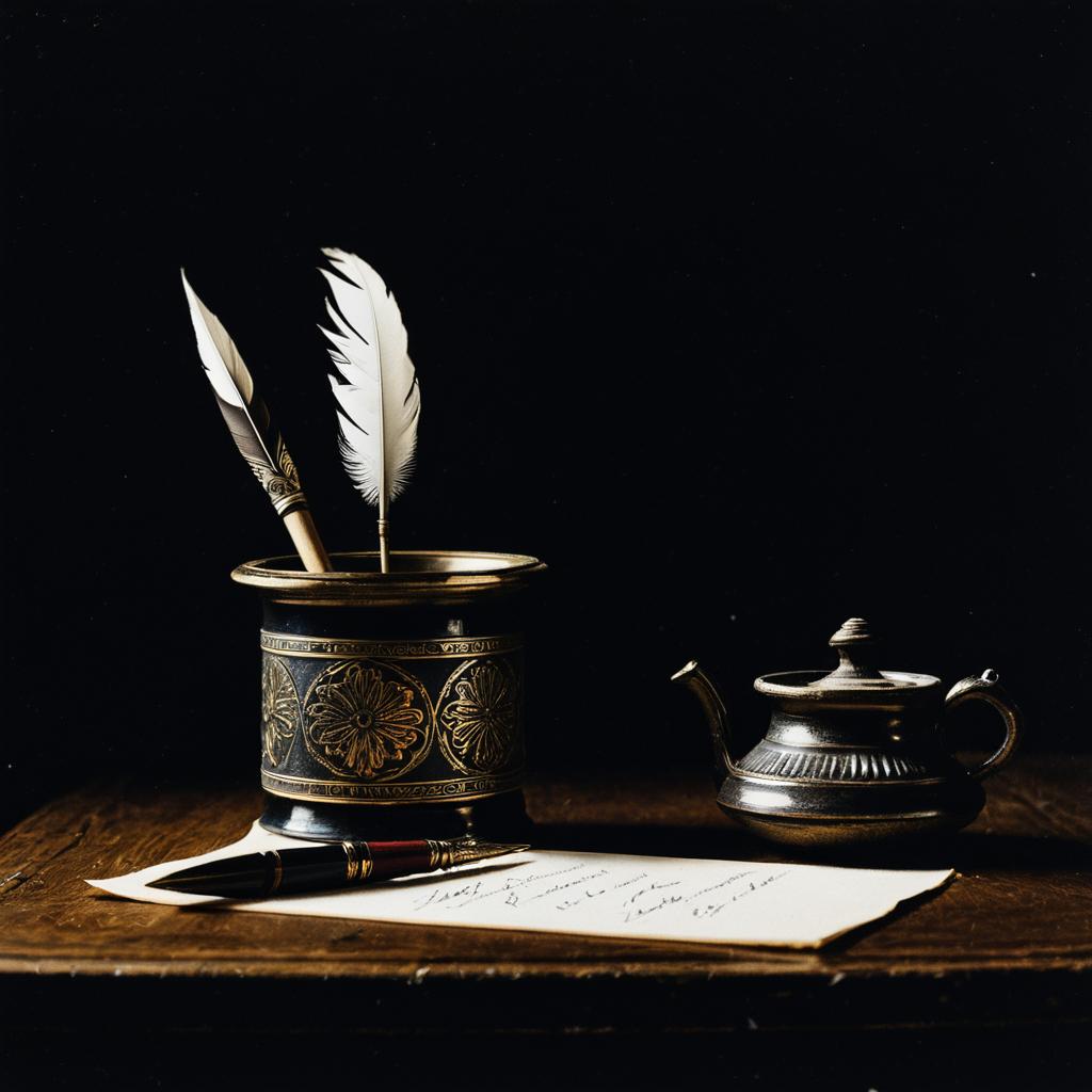 A photorealistic still life composition featuring elegant antique quill pens placed inside a decorative ink pot, accompanied by an ornate ink container and a handwritten letter on a wooden surface. The image showcases chiaroscuro lighting, highlighting the detailed textures and metallic elements, reminiscent of Rembrandt's style.