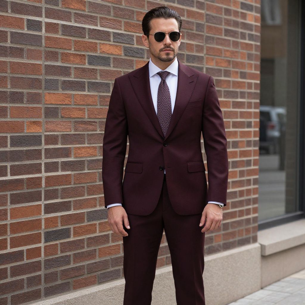 A stylish man stands confidently against a brick wall, exuding professionalism and elegance in his tailored burgundy suit. The urban backdrop, combined with his polished look, creates an artistic contrast that captures a modern fashion aesthetic.