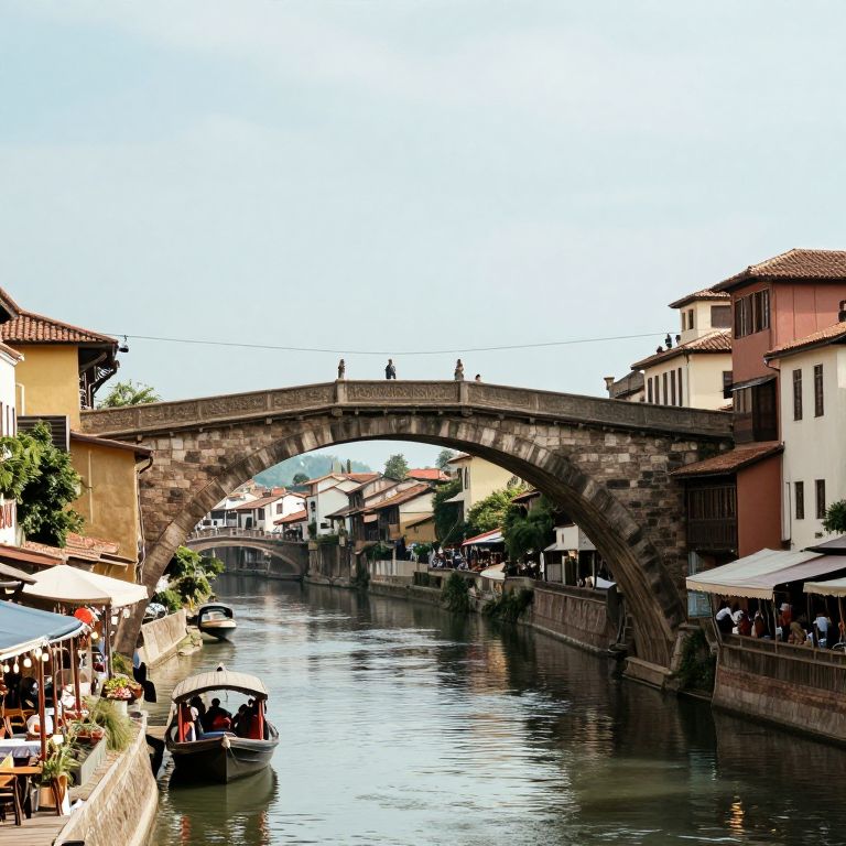 Suspended between past and future, the arched bridge whispers of timeless serenity, where the echoes of ancient markets blend with the whispers of modern dreams, inviting contemplation amidst the vibrant pulse of life below.