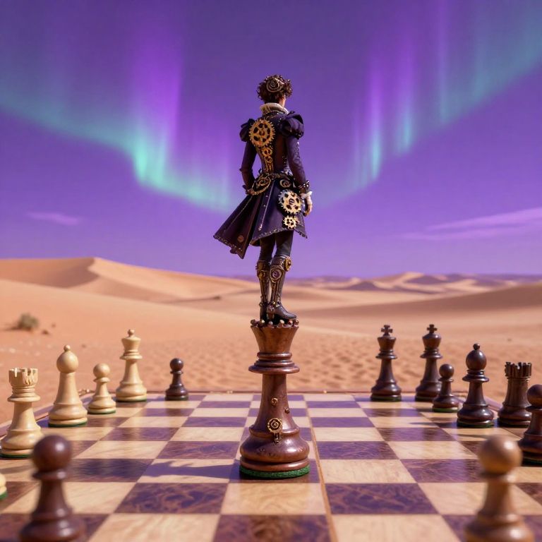 Craft an 8k HDR digital artwork depicting a surreal chessboard sprawling across a desolate desert under a vivid purple sky. A solitary figure in Victorian-era attire, embellished with intricate gears and cogs, stands atop a chess piece, contemplating the horizon. The whimsical and melancholic atmosphere captures the fleeting nature of dreams while emphasizing the fine details of the character's steampunk-inspired outfit. Illuminate the scene with dynamic light effects from distant auroras, casting an ethereal glow that imbues the image with mystery and wonder.