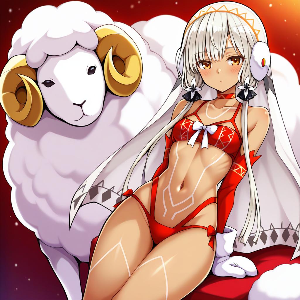 Digital illustration of a dark-skinned anime girl with white hair and red eyes wearing a red bikini-style outfit with detached sleeves, mittens, and a veil. The character has full-body white tattoos, a choker, and earmuffs. She is posed sitting beside a large white sheep with golden horns, set against a warm gradient background.
