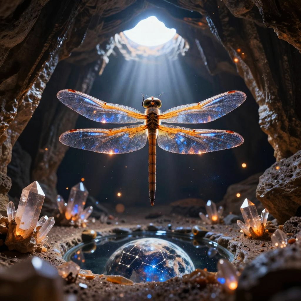 Bioluminescent Crystal Dragonfly in Moonlit Cavern