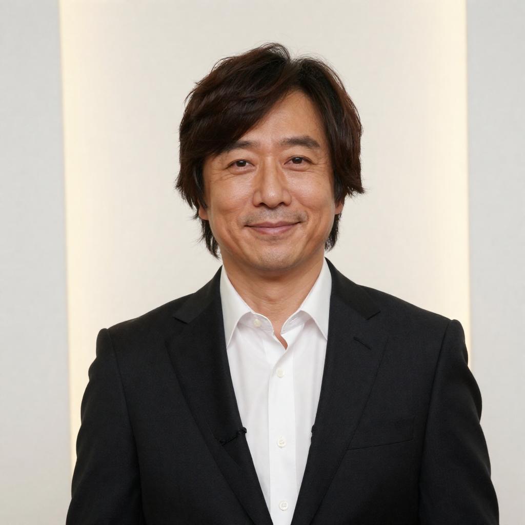 Photograph of a smiling man with medium-length black hair, wearing a red and white striped sleeveless shirt over a black t-shirt, and black pants. He sits on a desk, hands resting on his thighs, in a dimly lit room with a computer monitor and desk items in the background.