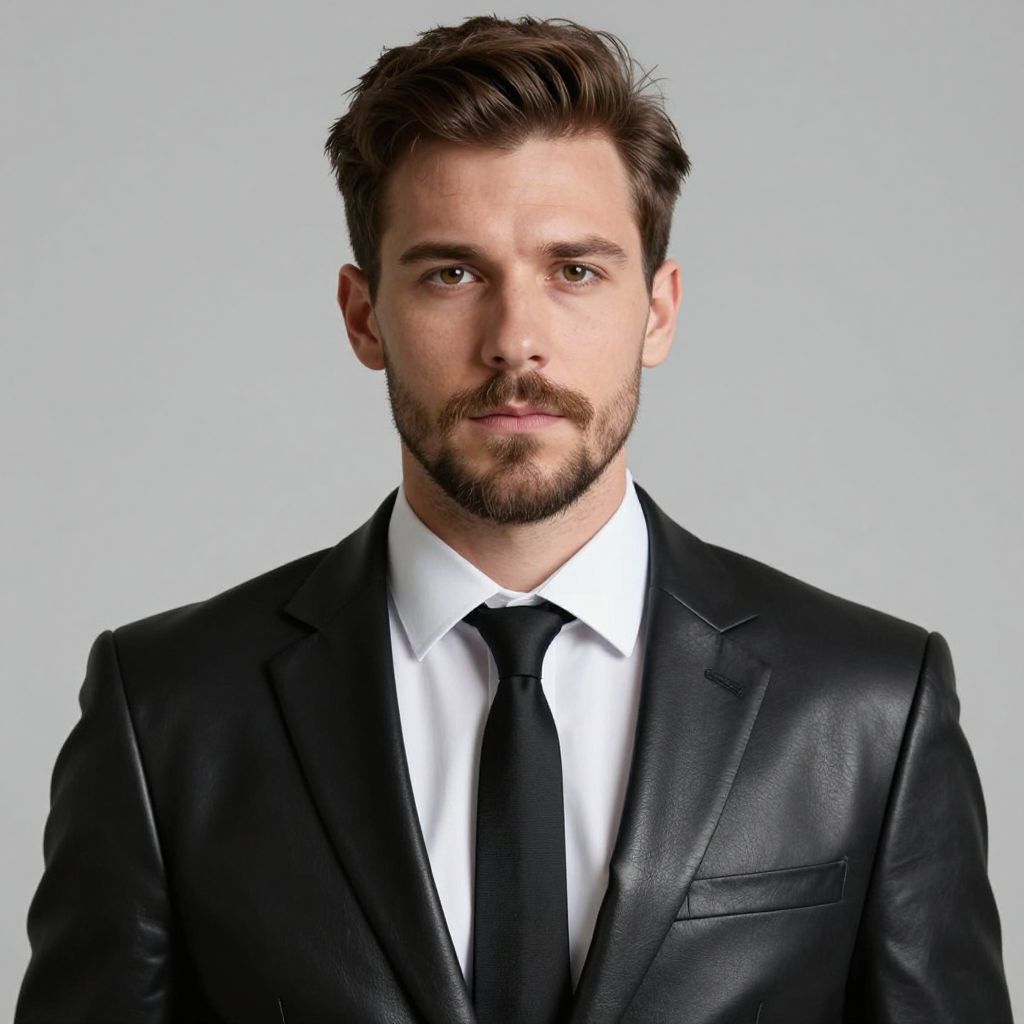 Man leather suit, 1boy, male focus, solo, necktie, facial hair, suit, formal, black necktie, shirt, realistic, brown hair, white shirt, looking at viewer, collared shirt, jacket, black jacket, upper body, mustache, beard