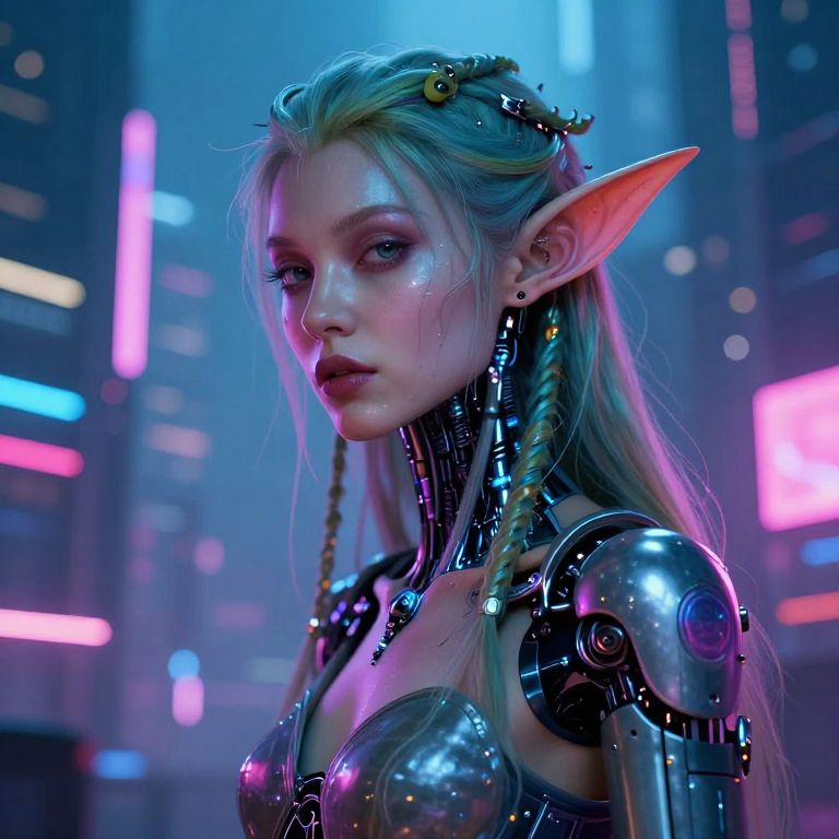 This is a highly detailed, digital CGI artwork of a cyberpunk-style elf woman with long, blonde hair adorned with metallic accessories and a golden hairpin. She has large, pointed ears and is wearing a form-fitting, metallic bodysuit with visible robotic joints and circuits on her shoulders and neck. Her skin is pale and her eyes are a piercing blue. The background is a futuristic cityscape with neon lights in pink, blue, and purple hues, creating a vibrant, high-tech atmosphere. Her expression is serious and focused, adding to the overall sci-fi and cyberpunk theme.