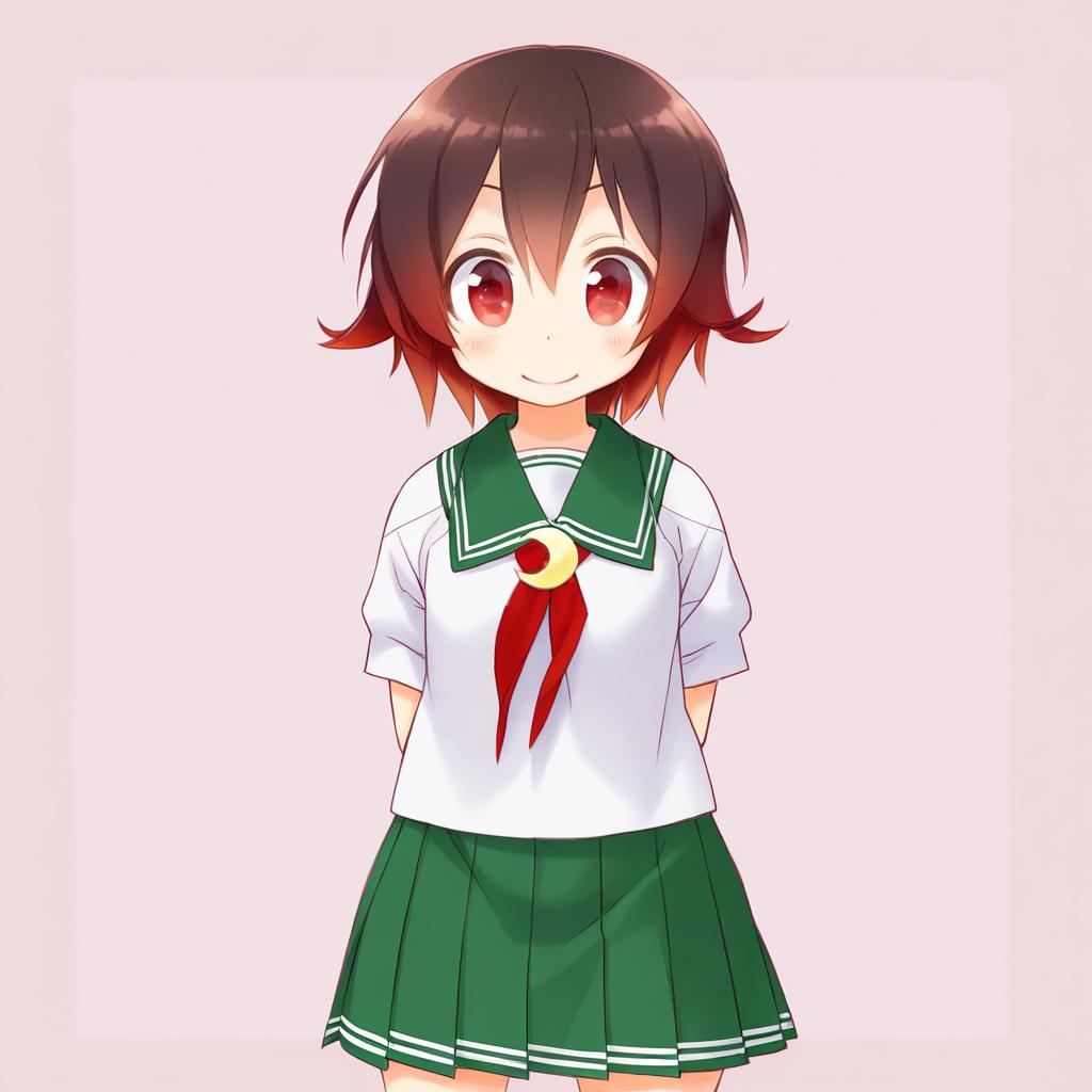 Mutsuki kai ni (kancolle), kantai collection, 1girl, red eyes, brown eyes, short hair, brown hair, gradient hair, red hair, serafuku, serafuku, green skirt, pleated skirt, green sailor collar, crescent pin, red neckerchief, by artist mizuki kotora, leet