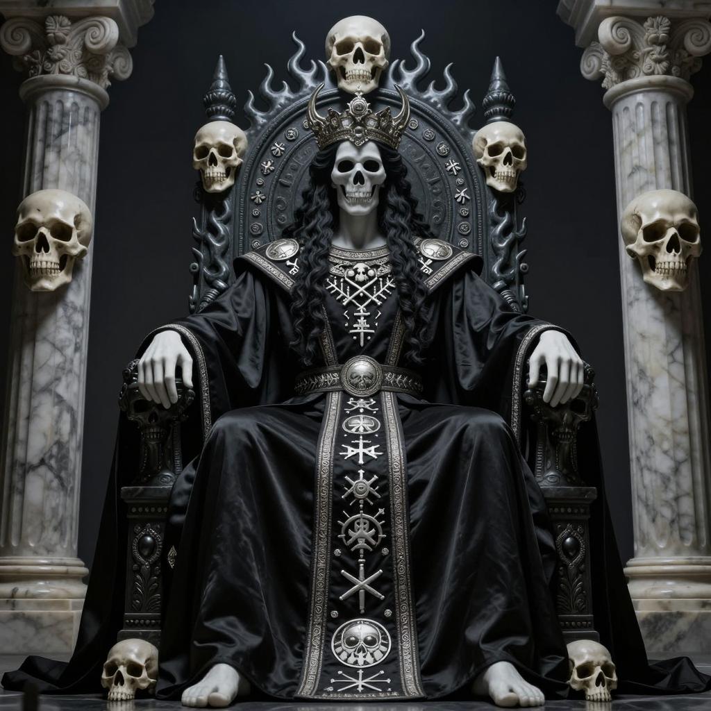 A regal figure representing Hades, god of the underworld, seated on a dark marble throne adorned with skulls and flame motifs. The figure wears elegant black silk robes embroidered with silver mystical symbols and warnings of death. Flanked by marble pillars featuring skull designs, the setting evokes an eerie realm of eternal night and shadow.