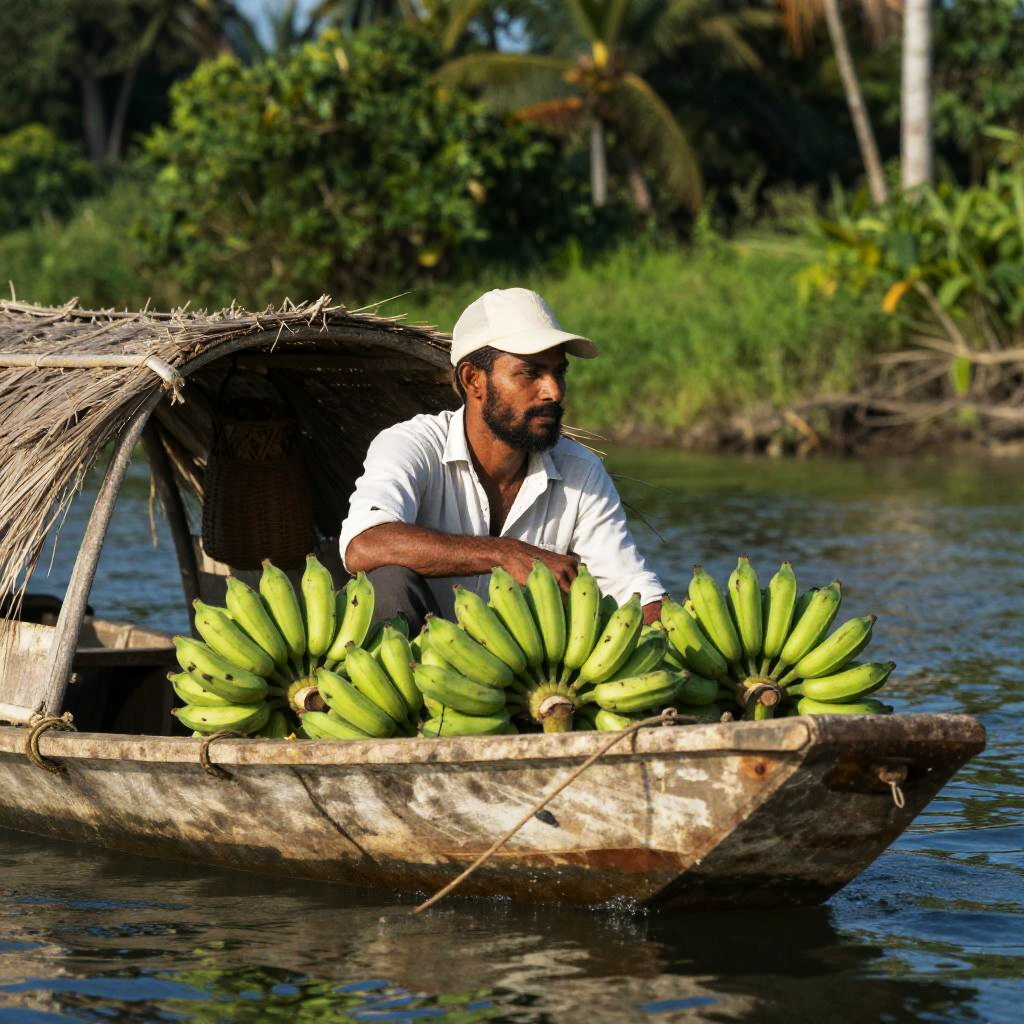 Photograph of a man on a rustic wooden boat filled with green bananas. He has a beard, wears a white shirt and hat, and looks to the side. The boat has a thatched roof and hangs a basket. Dense green forest in the background. Blue water surrounds the boat. Man's right arm rests on a rope. Sunlight illuminates the scene.