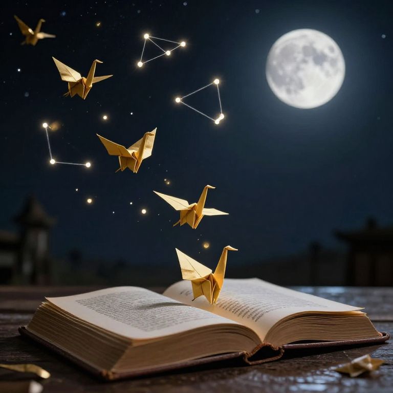 Photograph of an open book with glowing paper cranes flying towards a bright full moon, surrounded by star constellations, against a dark night sky