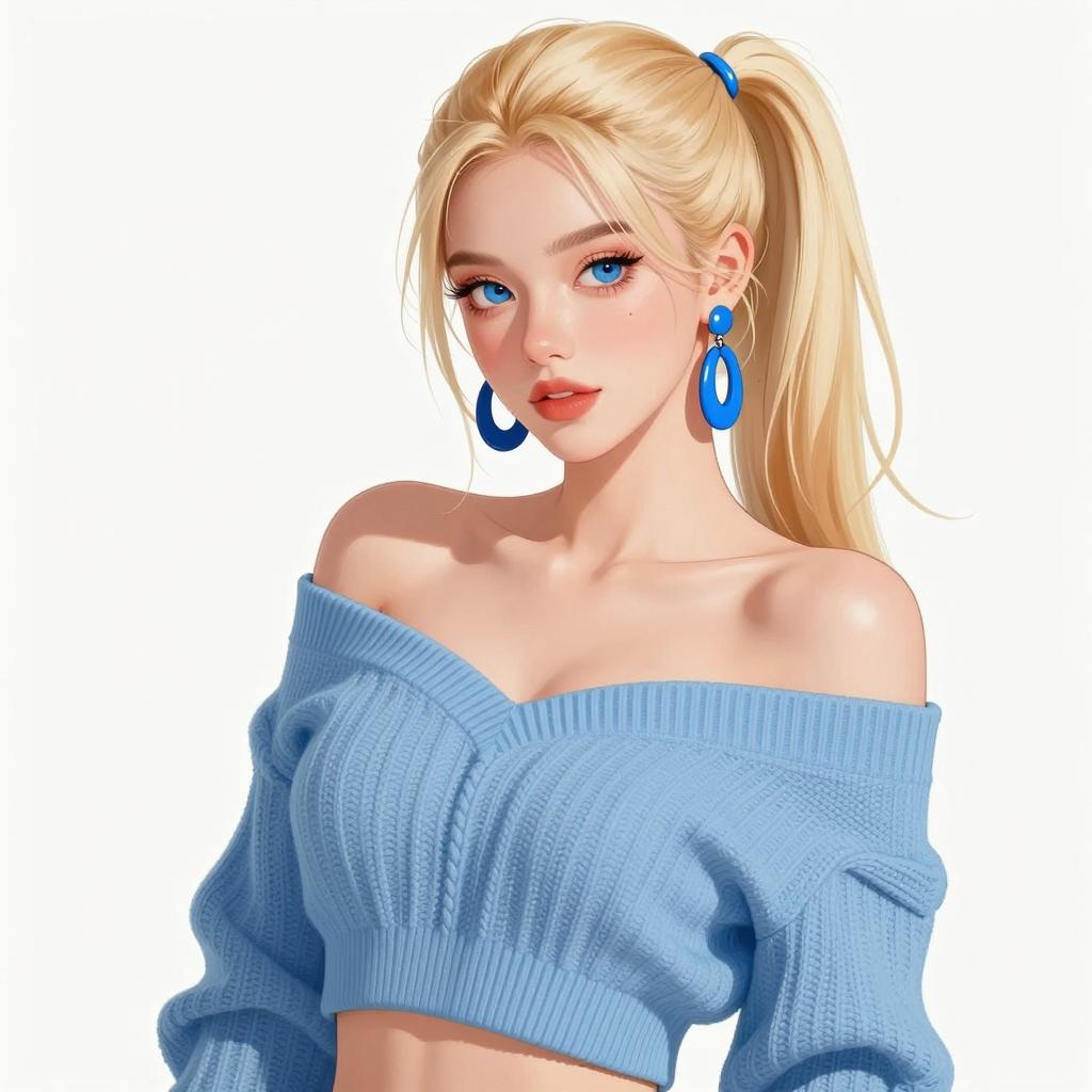 Illustration of a young woman with long black hair, wearing a blue sports bra and shorts, with a blue Adidas jacket off her shoulders. She has blue nails, a choker, and blue earrings. Her left hand rests on her hip. The background has repeating blue and white heart shapes. Her expression is neutral. The style uses bold, contrasting colors with a pink hue over her skin. The Adidas is visible on the jacket.