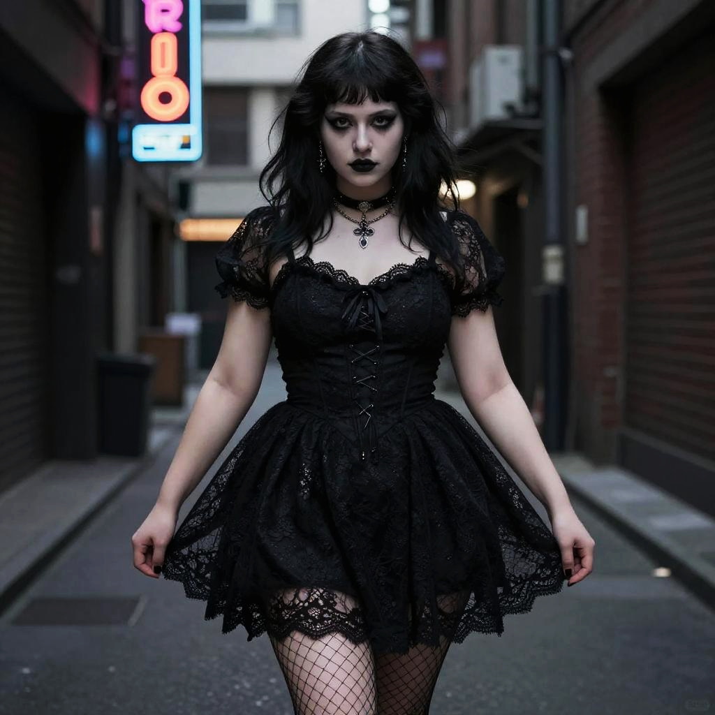 Gothic woman with pink and black hair, purple eyes, and heart tattoos wears pink corset and tulle dress, standing in rainy window.