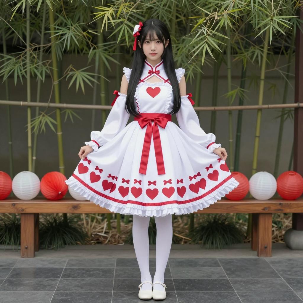 East Asian woman with long black hair, wearing a white and red traditional dress with heart and bow patterns, red ribbon sash, and white frilled stockings. She stands on a dark tile floor, in front of a wooden bench with red and white decorative balls. Background includes green bamboo. Her hands hold the sides of her dress. She has a neutral expression. Image is a photograph. Website URL is in the bottom right corner.