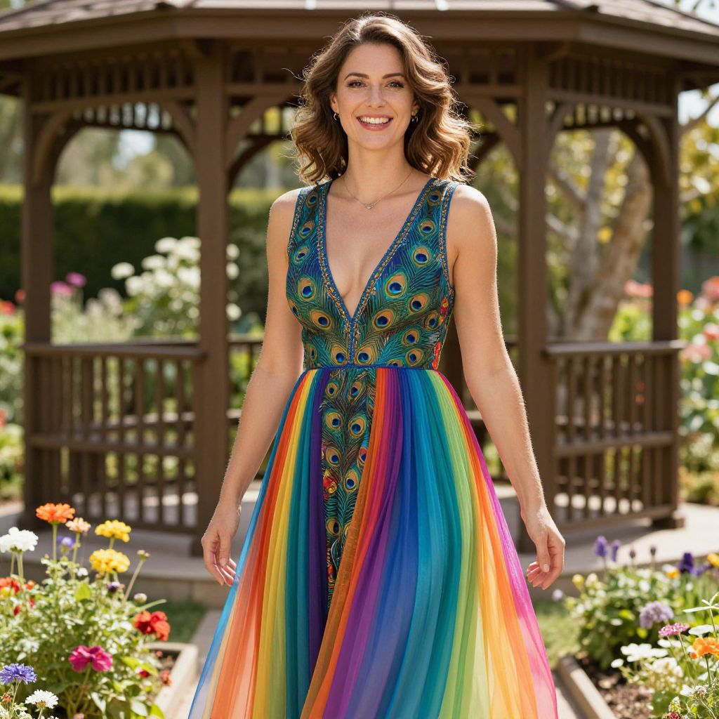 Photograph of a smiling woman with wavy brown hair wearing a vibrant, sleeveless, deep V-neck dress with peacock feather patterns. The dress has a rainbow-colored, flowing skirt. She stands in a sunny garden with a wooden gazebo in the background, surrounded by colorful flowers and greenery. The sunlight highlights her happy expression and the dress's vivid colors.