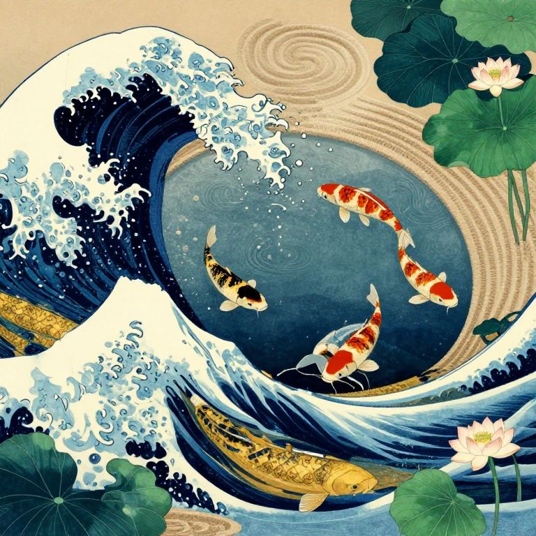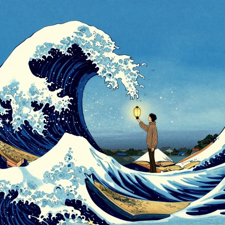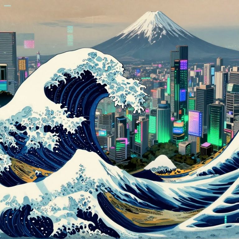 Envision an aerial view combining Hokusai's iconic wave with psychedelic poster aesthetics from the 1960s. The towering wave meets trippy geometric shapes reminiscent of kaleidoscopic dreams, with swirling patterns seamlessly blending into vibrant hues. As the sun sets behind distant mountains, its warm glow is refracted through airborne water droplets, casting an iridescent light over the scene and evoking a sense of awe at the mysterious beauty within nature's embrace.