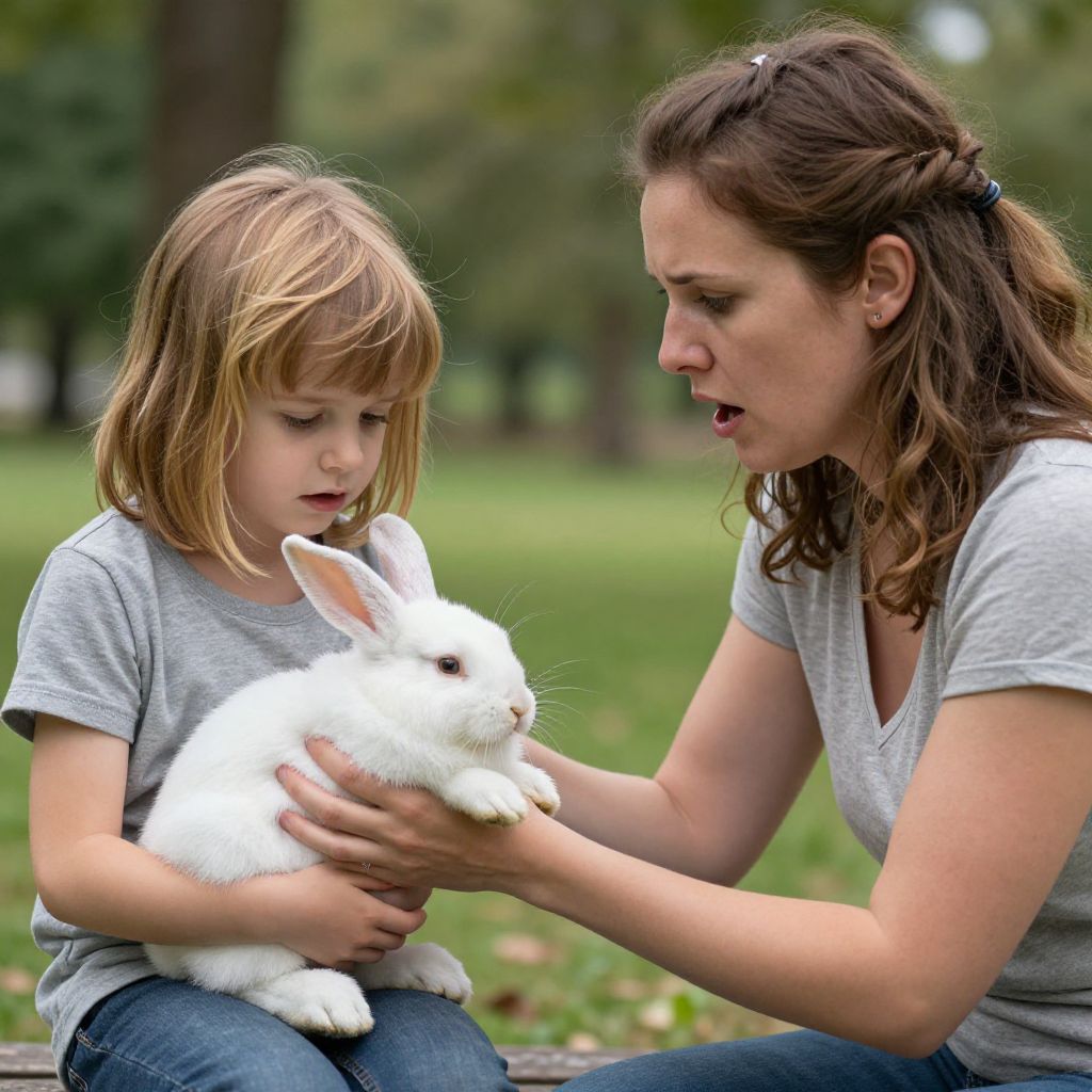 Photograph of a young white girl with light brown hair in a blue dress standing next to a white woman with brown hair in a grey shirt, who is kneeling and holding a white rabbit. The girl looks down at the rabbit, while the woman looks at the girl. They are outdoors in a grassy park with blurred trees in the background. The woman's expression is focused and caring, and the girl appears curious. The rabbit is small, with long ears and a fluffy coat, and is held gently in the woman's hands. The image is brightly lit with natural daylight.
