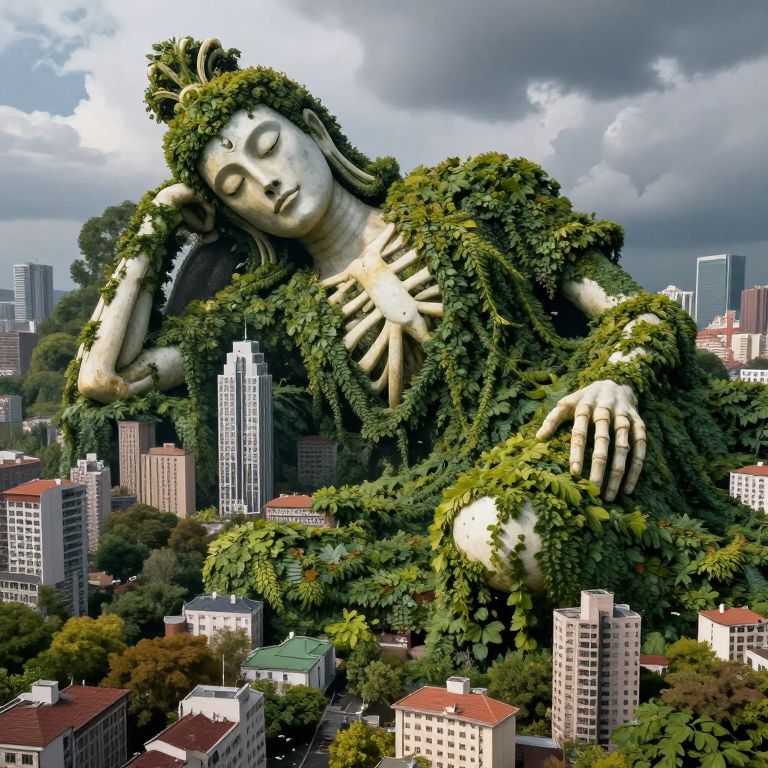 A CGI image depicts a massive, green-leaf-covered Buddha statue towering over a cityscape. The statue's serene face and closed eyes are detailed with pale white skin peeking through the foliage. Its right hand rests on its chest while the left hand is in a mudra position. The city below features various buildings, including high-rises and smaller structures, with a mix of red and green rooftops. The sky is overcast with dark, cloudy weather. The statue's size contrasts sharply with the city's scale, emphasizing its colossal presence. The image blends realism with surrealism, highlighting the statue's natural integration into the urban environment.