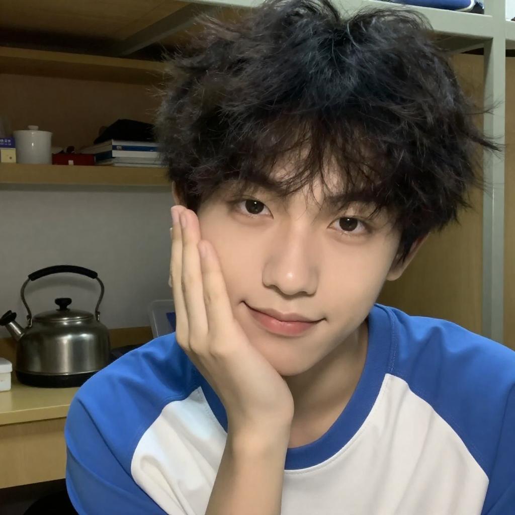 Young man with dark, tousled hair, pale skin, and slight smile, wearing a blue and white shirt, hand raised to face. Background: shelf with boxes and a metal kettle. Soft, warm lighting. Casual, intimate setting.