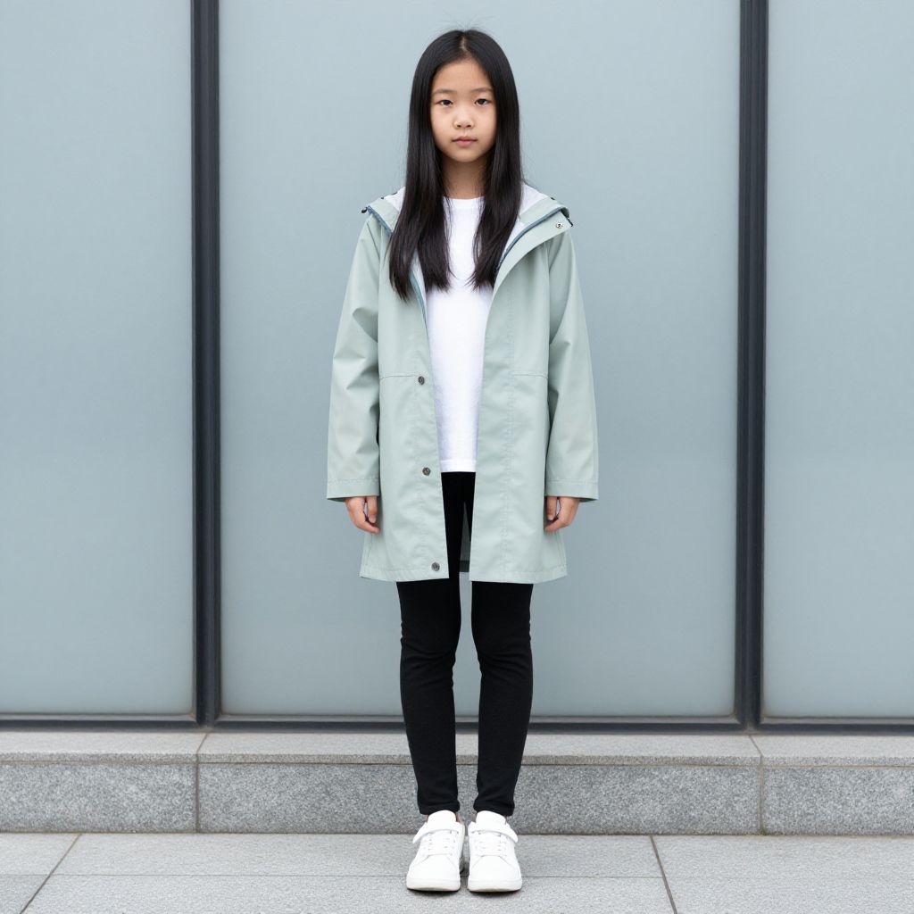 Photograph of a young Asian girl with long black hair, wearing a light gray trench coat, white shirt, black pants, and white sneakers, standing