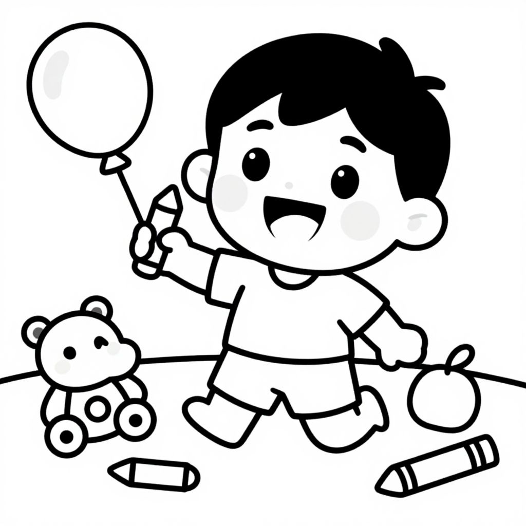 Black boy coloring page, happy smiling child playing with crayons, simple bold outlines for easy coloring, joyful scene with toys and balloons, cartoon style, high contrast black and white illustration, clear and fun for kids to color