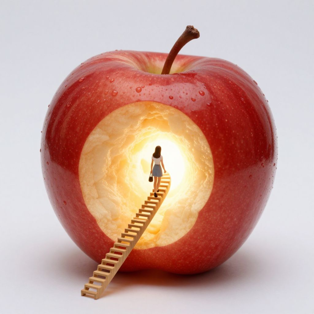 A surreal scene unfolds as a miniature woman ascends a wooden staircase spiraling through the hollowed center of a vibrant red apple, illuminated by a warm, glowing light emanating from within.