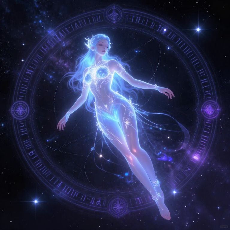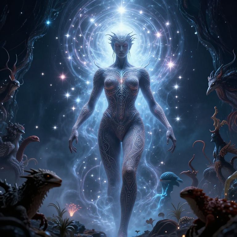 A humanoid eldritch god emerging from a portal of shimmering stars, intricate alien symbols etched on skin, surrounded by strange fauna, eerie cosmic energy radiating
