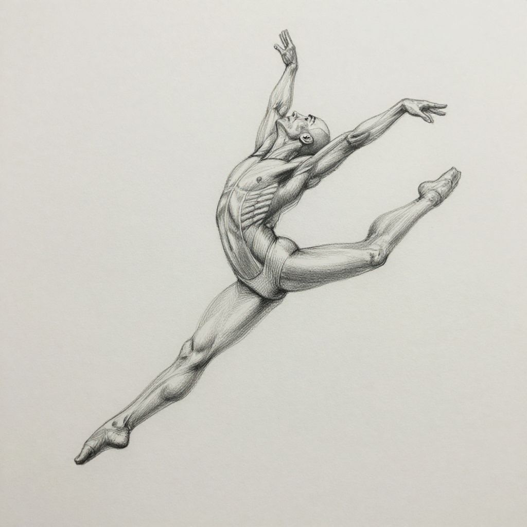 Sketch reference focusing on human anatomy, dynamic pose of a dancer mid-leap, fine pencil strokes illustrating muscle tension and fluid motion, minimalist background, emphasis on proportion and gesture drawing, natural shading techniques.