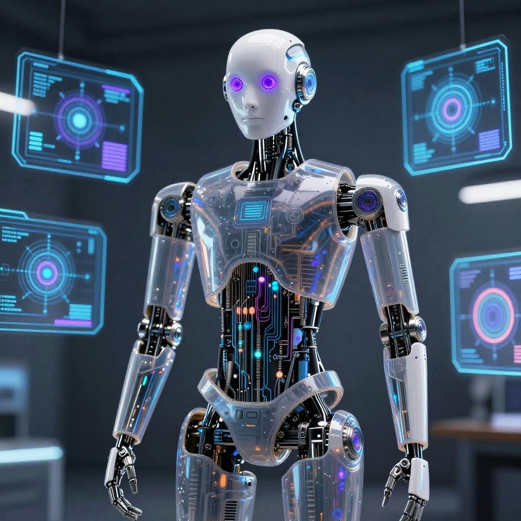 Clothoff AI concept, humanoid robot with transparent panels revealing intricate circuits, glowing eyes in deep purple, surrounded by holographic displays and AI algorithms, sleek sci-fi environment, photorealistic style
