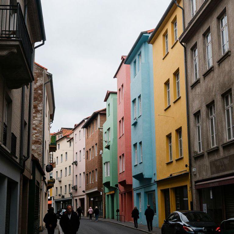 A street in which buildings emotively change shape and color based on the collective moods of unseen passers-by below.