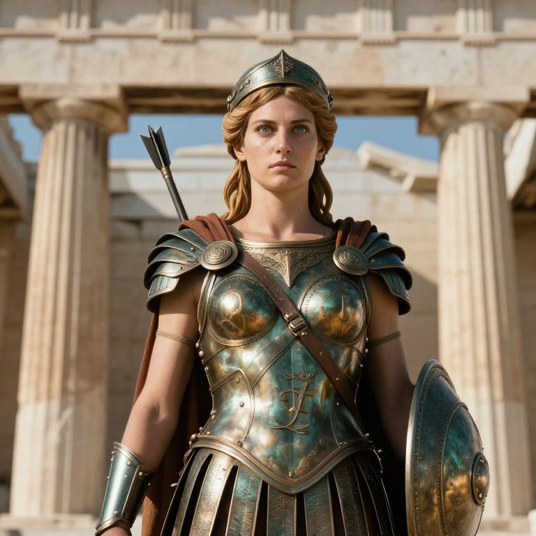 A realistic photographic depiction of Athena, the warrior goddess of wisdom and strategy, standing atop a ancient Greek temple, clad in full detailed bronze armor with intricate etchings of arrows and shields, her face sharp and serious with piercing green eyes, calm yet powerful expression, glowing with inner wisdom as sunlight streams through the marble columns, emphasizing her strength and divine authority.