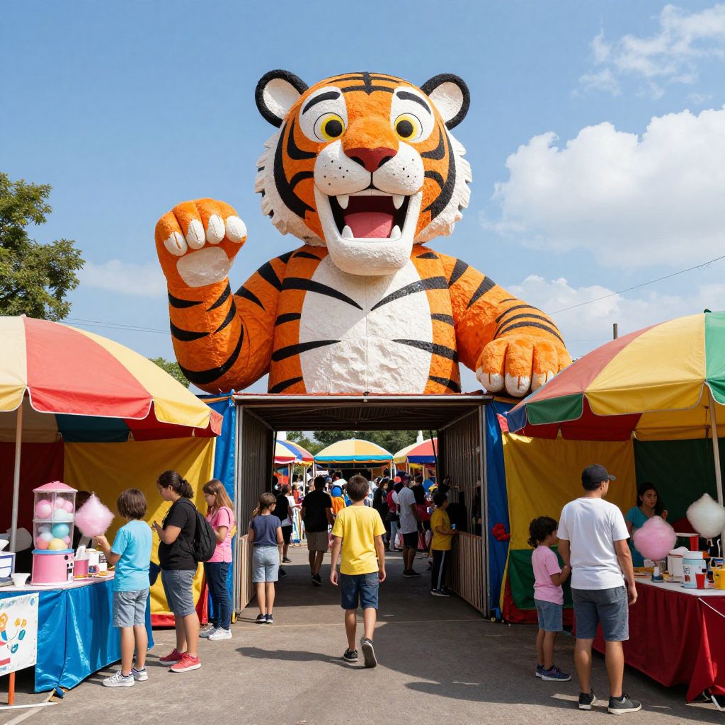 Carnival entrance guarded by a colossal, grinning tiger puppet with vibrant orange stripes, flanked by colorful tents and bustling crowds of children and adults enjoying rides and cotton-candy dispensers beneath a bright blue sky.