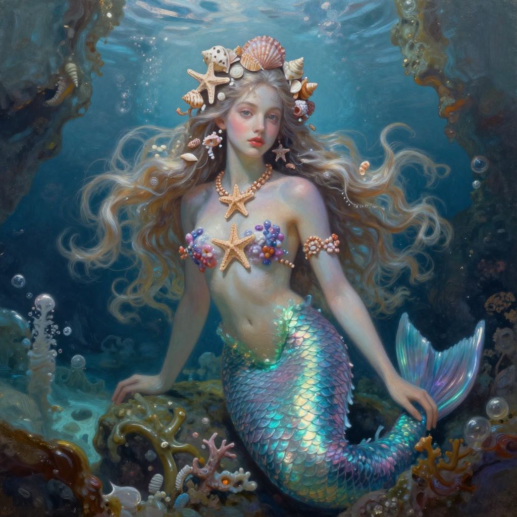A digital illustration depicts a serene mermaid with long, flowing orange hair and pale skin, wearing a coral pink top and iridescent green and yellow fish-scale tail. She lies on a textured, teal aquatic floor, surrounded by colorful, translucent orbs and various seashells, including a pink starfish and an octopus-like creature in a shell. Two glowing, circular, rainbow-hued lights float on either side of her. The overall style is whimsical and fantasy-like, with a soft, dreamy color palette and smooth, glossy textures.