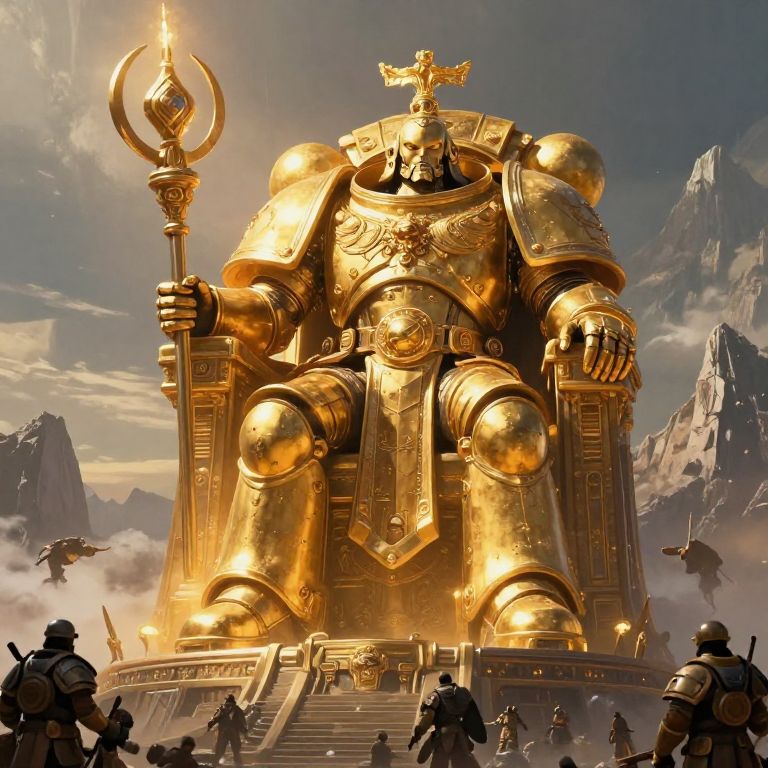 Majestic scene showing the Emperor of Mankind elevated on a massive throne atop a mountain, glowing golden armor shining brightly, colossal size dwarfing the landscape and his subjects, captured in a detailed, atmospheric sci-fi fantasy illustration.