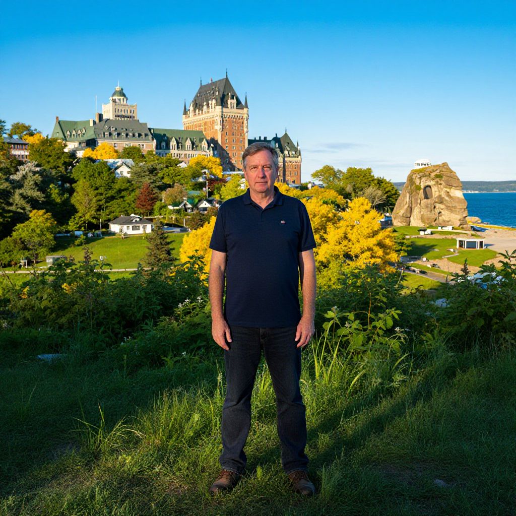 [[man,mackinac island photos]]Captivating portrait of a man standing tall amidst the picturesque scenery of Mackinac Island, surrounded by an explosion of vibrant hues - emerald greens, radiant yellows, and deep blues. The island's iconic landmarks like the Grand Hotel and Arch Rock stand out against the lush greenery, with warm sunlight casting long shadows across the terrain. Soft Man has masculine face and piercing eyes