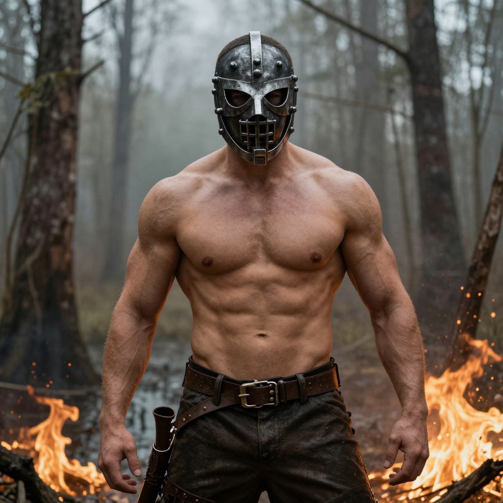 A muscular man in a heavy iron mask stands in a burning swamp, with dramatic lighting and epic composition.