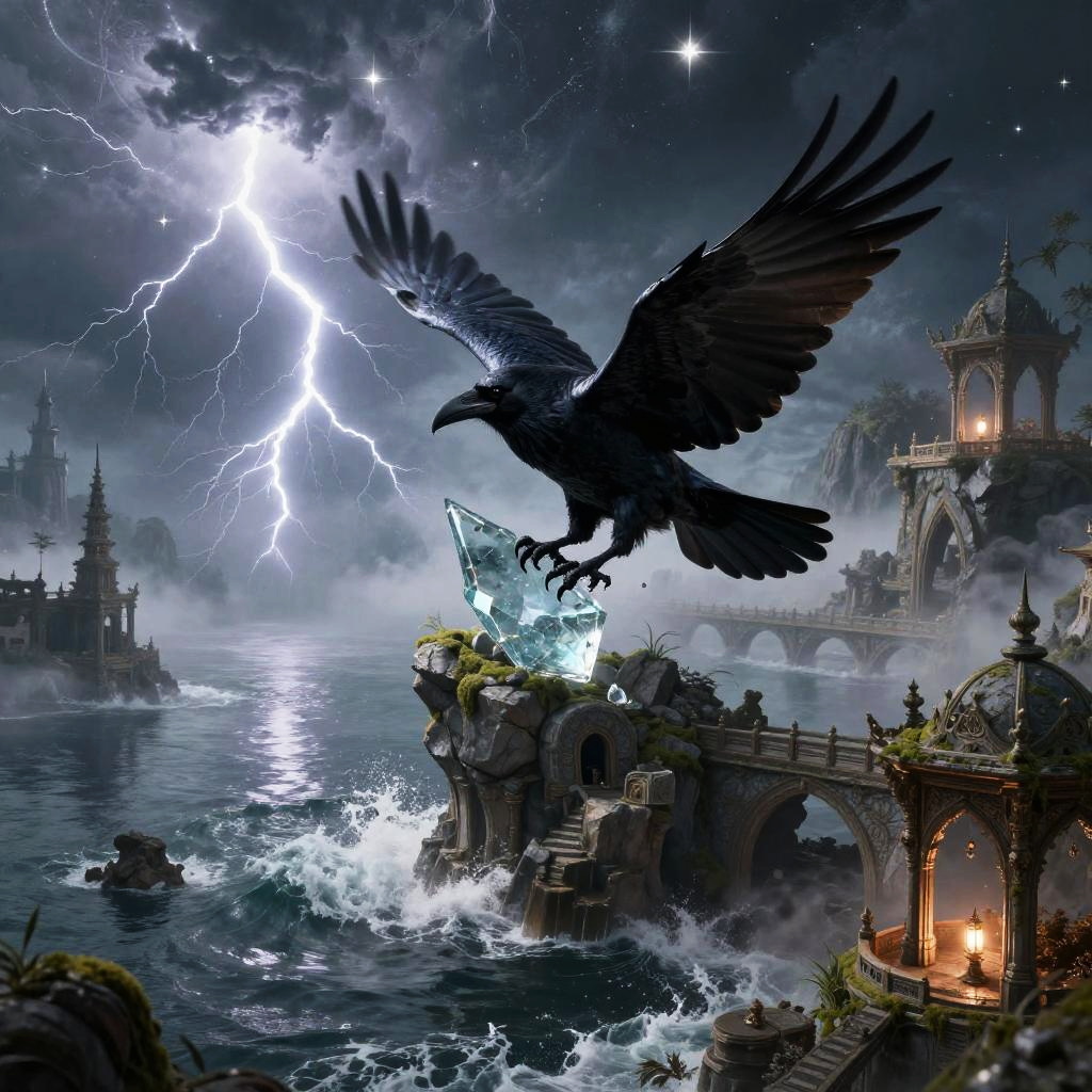 A giant raven in mid-flight clutching a shard of ancient glass set within craggy peninsula with weathered ruins and crashing ocean waves, wrapped in ethereal mist and drifting incense, glowing stars scattered above, a celestial vault painted with stormy slate greys highlighted by cold silver lightning flashes. Tranquil waters mirror the heavens, distant spires and bridges on rocky arches, lantern-lit sanctuaries and mossy terraces, a serene dreamlike atmosphere with surreal, intricate details; cinematic composition, volumetric fog and light rays, hyper-detailed textures, high dynamic range, wide-angle vista, depth of field, soft rim light, subtle film grain, epic scale.