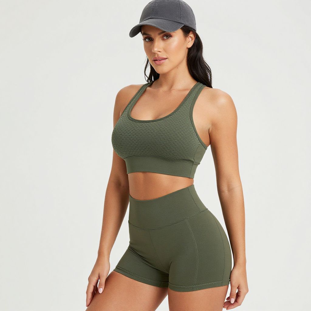 "Woman, athletic wear, olive green sports bra with racerback and textured pattern, matching high-rise athletic shorts with a small side pocket, grey baseball cap, white background. Sexy. Pretty face and beаutiful eyes. Big breasts."