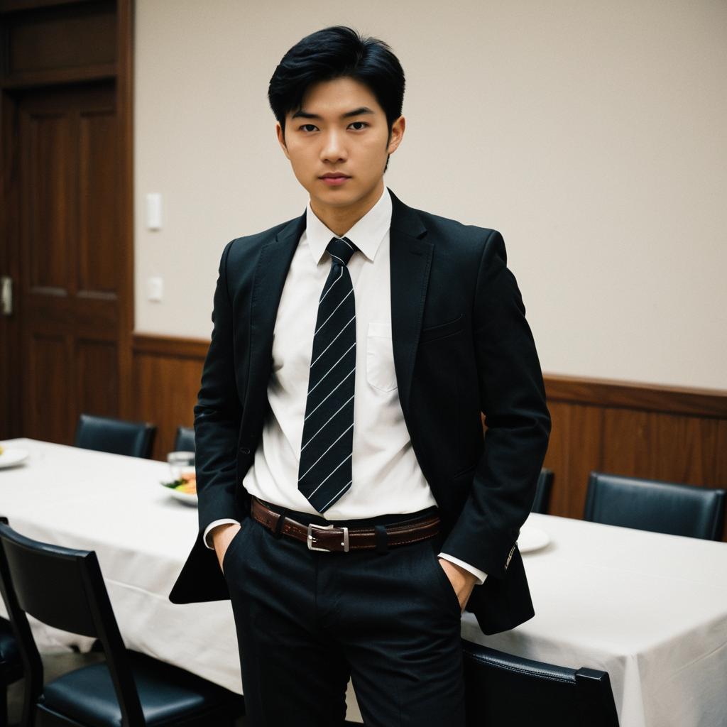 Business casual dinner,1boy,male focus,solo,realistic,shirt,black hair,jacket,belt,white shirt,pants,suit,formal,collared shirt,hands in pockets,black belt,asian,black pants,cowboy shot,looking at viewer,black jacket,necktie